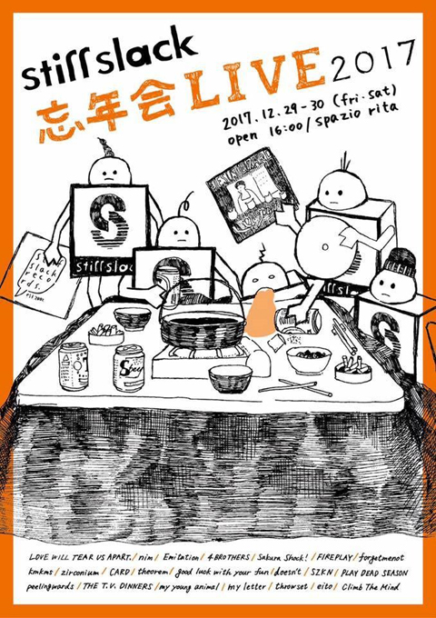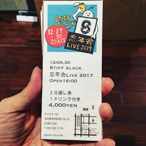 stiffslack忘年会2017、12/29~30に名古屋矢場町のspazio ritaにて開催。両日とも16:00スタートでノンストップで演奏と宴が繰り広げられる地獄絵図です。