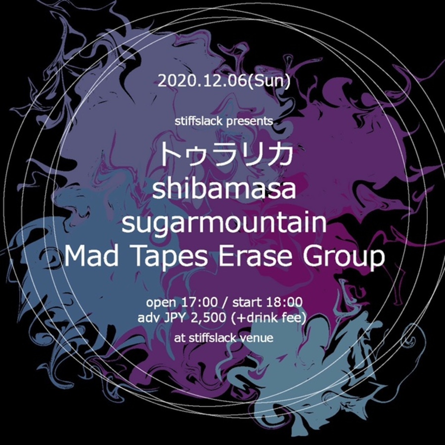 名古屋の秘宝トゥラリカが本当に久々に人前で演奏且つstiffslack venue初登場!対バンのsugarmountain、shibamasaも同じくSS初登場!そして2度目の出演となる異形のインダストリアルフリーフォームトリオMad Tapes Erase Groupと未知なる音像を満遍なく体感できる一夜となります!