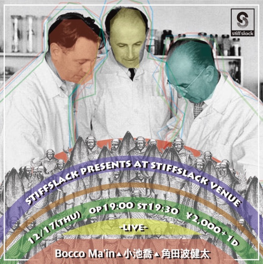 2020年、秋頃からライブ活動をスタートさせ耳の早いリスナーの心を掴み始めているイケダユウスケ(ex-TigerMos)率いるアシッドフォークバンド"Bocco Ma'in"がstiffslack venue初登場!完全に日本人離れした幽幻なアンサンブルと規格外の歌声に要注目です!対バンはブラジルコーヒー店主、The Pylamidの"角田波健太"ソロによる枯れたブルースフォーク、そしてお馴染みシラオカのフロントマンであり漫画マンでありデザイナー、アニメーター、吟遊詩人"小池喬"が久々に登場!