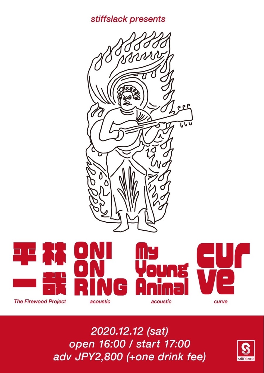The Fire Wood ProjectのGuitar & Vocal "平林ドンドン"こと平林一哉氏、また東京は小岩を拠点に圧倒的な歌唱力と説得力にて実直な活動を続けているエモーショナルロックバンドcurveがstiffslack venue初登場。対するはONIONRING、my young animalがアコースティック編成でのライブとなります。