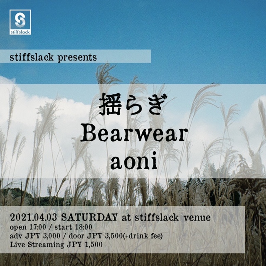 国内の若手シューゲイザーバンド筆頭"揺らぎ"、EMO/インディロックとドリームポップの平衡点の一つの回答とも言えるバンドBearwear、日本語EMOの新鋭aoniという日本の新世代ロックを担う三組がstiffslack venue初登場です!必見!