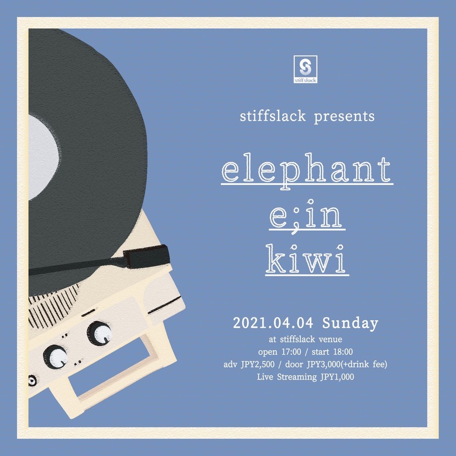 本州の最西端、山口県からテクニカルマスロックトリオ"elephant"が2021年初来名‼︎また京都からビューティフル轟音ポスロックサウンドをアップデートし続けている"e;in"、東京から若手シューゲイズ/インディーロック最右翼"kiwi"がstiffslack venue初登場です!マスロック/ポストロック/シューゲイズとSSファン大好物の三要素が揃ったイベントとなります。