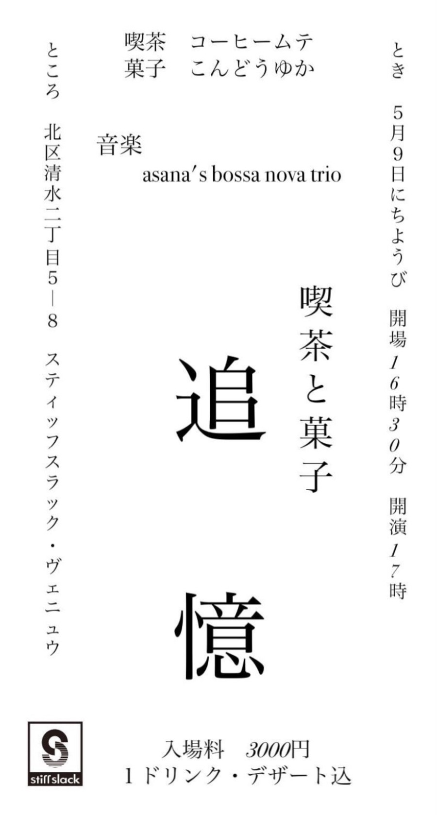 OPEN 16:30 / START 17:00¥3000(1drink,デザート込み)チケット前売・ご予約は店頭またはメールフォームで