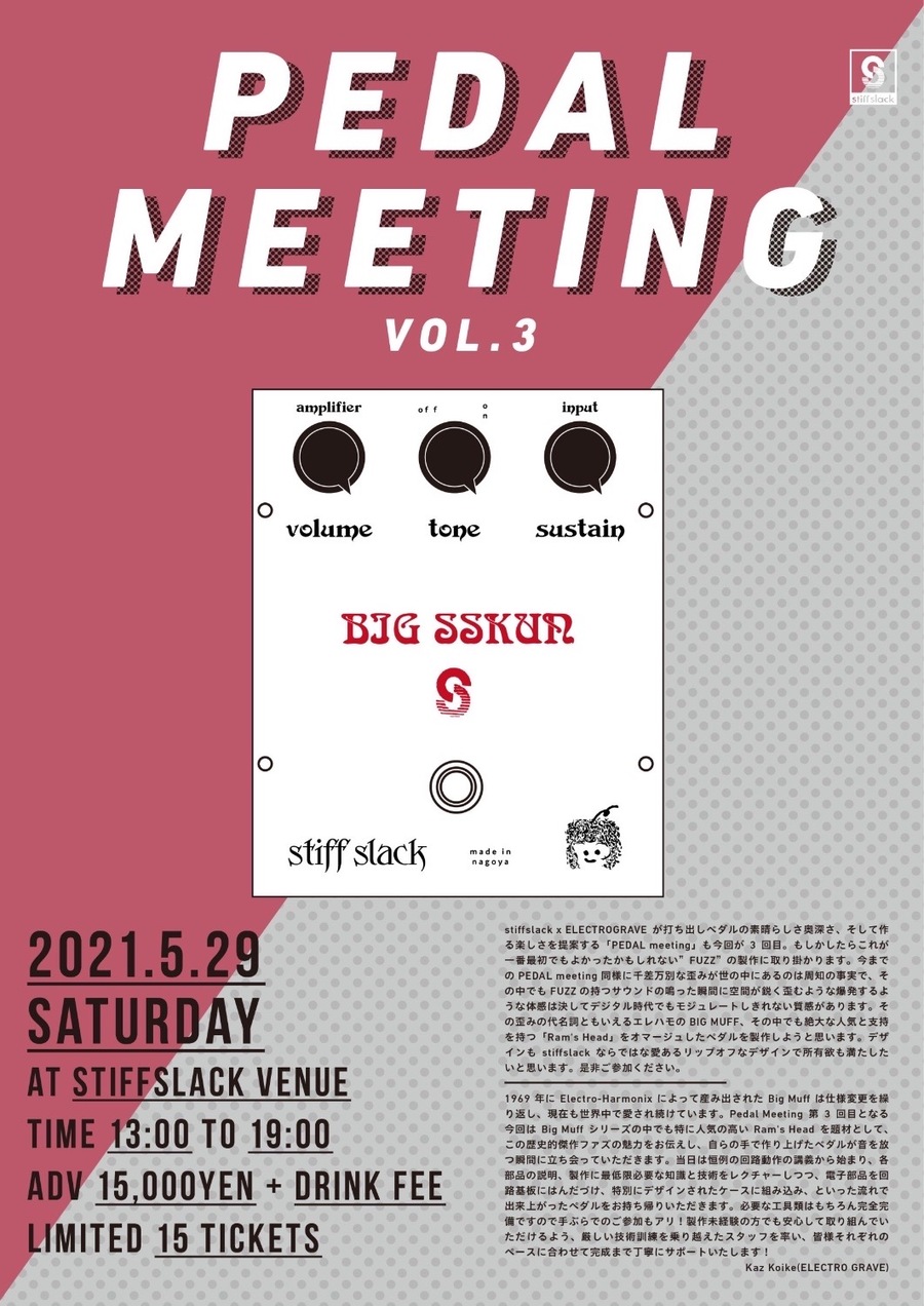 そして作る楽しさを提案する「PEDAL meeting」も今回が3回目。もしかしたらこれが一番最初で もよかったかもしれない"FUZZ"の製作に取り掛かります。 今までのPEDAL meeting同様に千差万別な歪みが世の中にあるのは周知の事 実で、その中でもFUZZの持つサウンドの鳴った瞬間に空間が鋭 く歪むような爆発するような体感は決してデジタル時代でもモジュ レートしきれない質感があります。その歪みの代名詞ともいえるエ レハモのBIG MUFF、その中でも絶大な人気と支持を持つ「Ram's Head」をオマージュしたペダルを製作しようと思います。デザ インもstiffslackならではな愛あるリップオフなデザイ ンで所有欲も満たしたいと思います。是非ご参加ください。