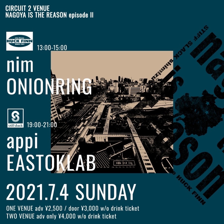 名古屋のライブハウス今池HUCK FINN/stiffslackによるサーキット企画NAGOYA IS THE REASONの第2回目が開催!HUCK FINN昼公演、SS夜公演という催しでして、両VENUEのヘッドライナーはHUCKFINNではnim、stiffslack ではnimの紅一点ギタリストhisana嬢のプロジェクトappiが登場!それぞれの対バンはHUCK FINNにてONIONRING、stiffslackにてEASTOKLAB!サーキットイベントということで両会場通し券も販売いたします!