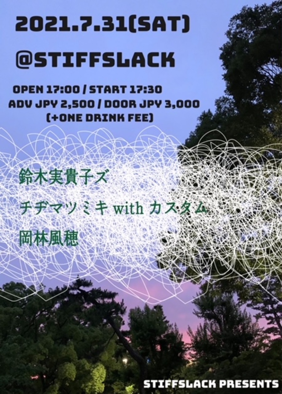 2021年7月最終日は三者三様の唄心ナイト!先日傑作アルバム"泥の滑走路"をリリースしたばかりの鈴木実貴子ズが2ピース編成にてstiffslack venue初登場!対するは東京より歌、アコギ、ドラムにてたおやかなアコースティックアンサンブルを奏でるチヂマツミキwithカスタム、そして岐阜は多治見より注目すべきSSW岡林風穂が登場です!