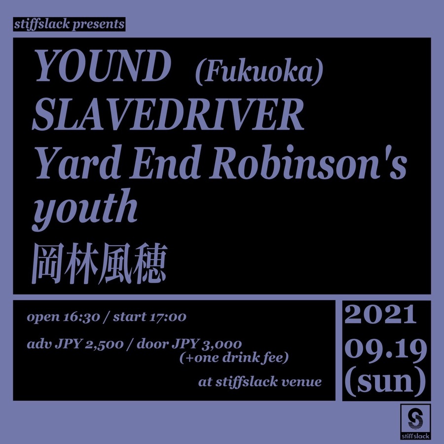 福岡にて精力的に活動しているインディーロックバンド"YOUND"がstiffslack venueに初登場。木訥とした風情を感じさせるグッドメロディ、アンサンブルは必聴必見。対するはこちらもグッドソング連発インディ/メロディックバンド"Yard End Robinson's"、メキメキとレベルアップしている真っ最中名古屋若手EMO筆頭"youth"、ジャンル問わず見たもの聴いたものの心を掴むSSW"岡林風穂"、そしてSS主催新川率いる"SLAVEDRIVER"による。彩り豊かなイベントになります。