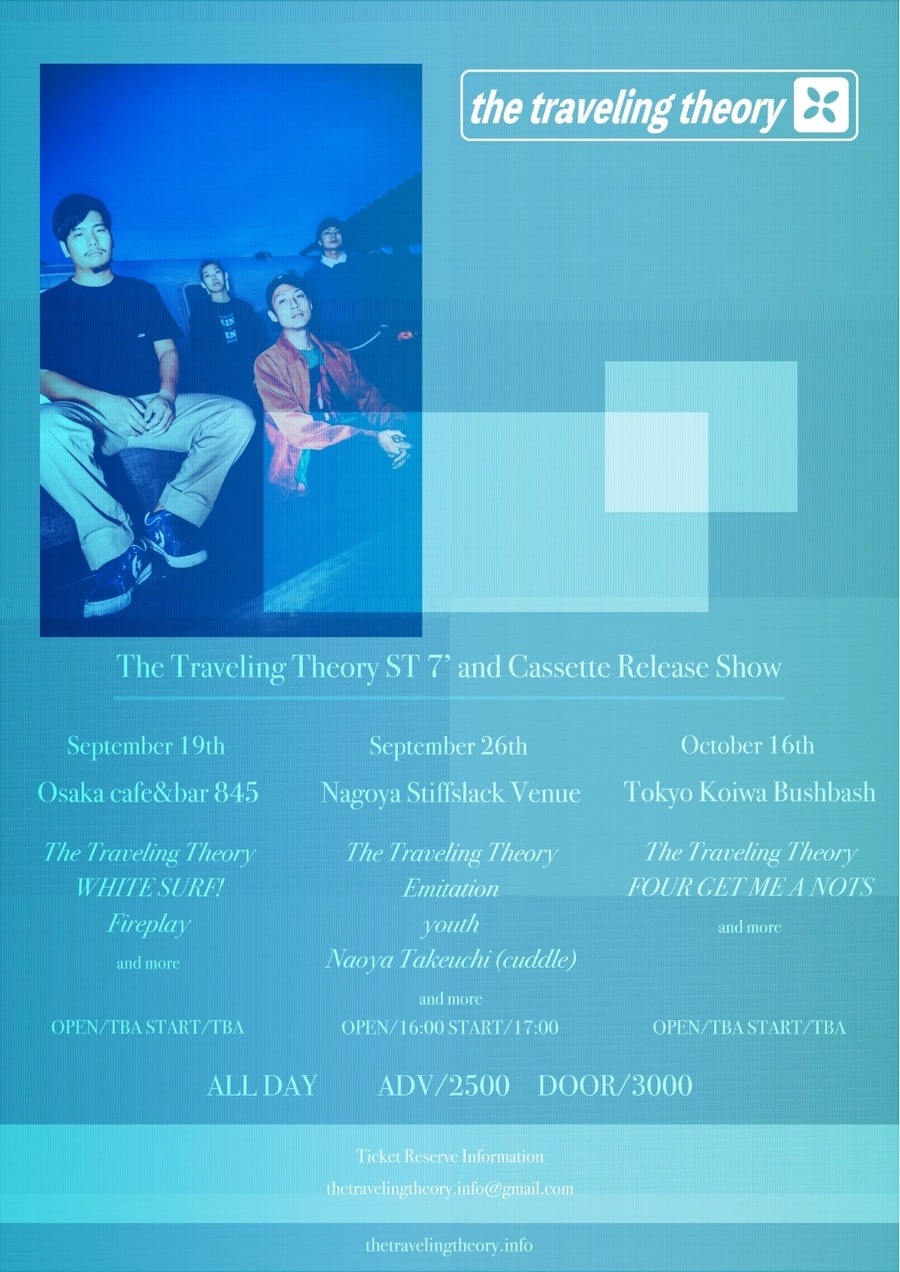 ジャパン千葉柏のエモバンド「THE TRAVELING THEORY」の2021年リリース2曲入りEP、同発のカセットのリリースパーティが開催!エモフリークには即反応のPENFOLDの曲名から拝借したバンド名とそのアンサンブルと衝動的な楽曲にジャパンエモシーンに新たな息吹をもたらします。対バンには名古屋ショートチューントゥインクルEMO"Emitation"に名古屋若手EMO筆頭株"youth"そしてカレーでお馴染み、否!名古屋インディロックcuddleのギターボーカル"たけうちなおや"による一夜となります!