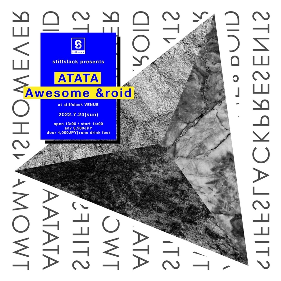 独自のDIYな活動方針や精神論、メンバー全員が蓄積してきた確固たる音楽趣向をマッシュアップさせたその佇まいが様々な世代から絶大な支持を得ている関東圏在住の6人組"ATATA"が遂にstiffslack venue初登場!!対するはこちらもメロディックパンクをルーツにEMO/ポストハードコアを独自に解釈、アップデートを重ねる"Awesome &roid"が登場!!互いに己の道を突き進むバンドの同士のツーマン!!お昼公演ですのでお時間お間違えなきようお願いします!!