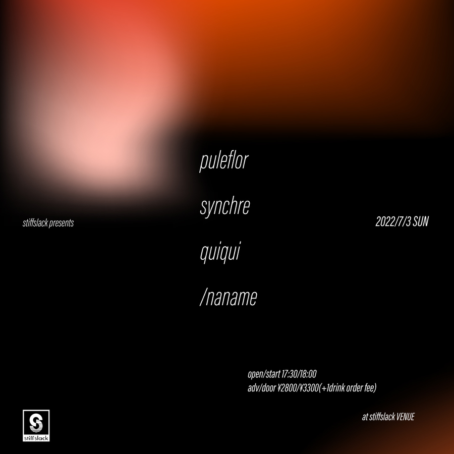 巷で密かな話題をよんでいる群馬産オルタナティブシューゲイズ"puleflor"が遂にstiffslack VENUE初登場!!そして彼等とも親交の深い東京のソリッドエレクトロポストロックトリオ"synchre"が再び登場。地元からは久々に登場、新作にて音楽的振れ幅を大きく進化させた様を見せつけた"quiqui"!!!!そして新生ミニマルポストロック"/naname"が早くも再登場です。