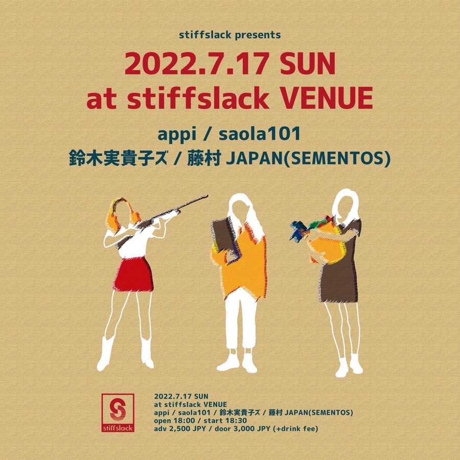 京都よりシューゲイズ~ドリームポップ、ポストロック、エモを横断する"appi"、未だヴェールに包まれたアヴァンミュージックプロジェクトsaola101、東京の日本語EMO"SEMENTOS"よりギターボーカル"藤村JAPAN"、そして地元名古屋からは久々にstiffslack VENUEに登場!!"鈴木実貴子ズ"の四本立て!!!!濃厚かつピュアな音楽表現を堪能できる一夜ですね!!