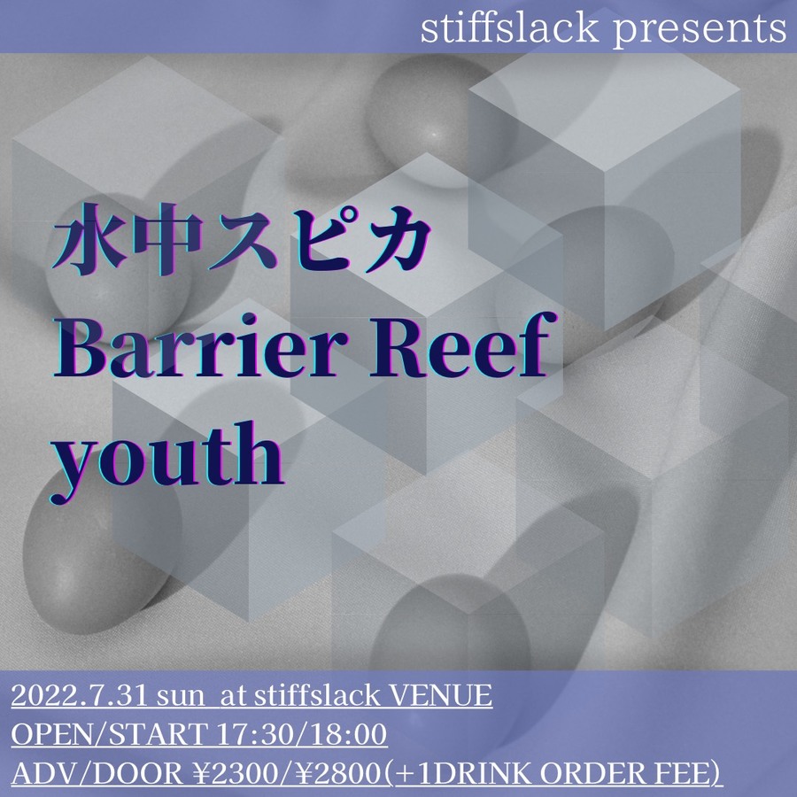 目下待望の新作をレコーディング中の京都のビューティフルマスEMO"水中スピカ"が久々に登場、レコーディングにて強度を上げたであろう演奏、新曲?に要注目!!そして当店でも大好評、仙台産ビューティフルインストEMO"Barrier Reef"がstiffslack VENUE初登場です。地元からは勢力的に活動しまくっている名古屋産日本語トィンクルEMO"youth"!!!