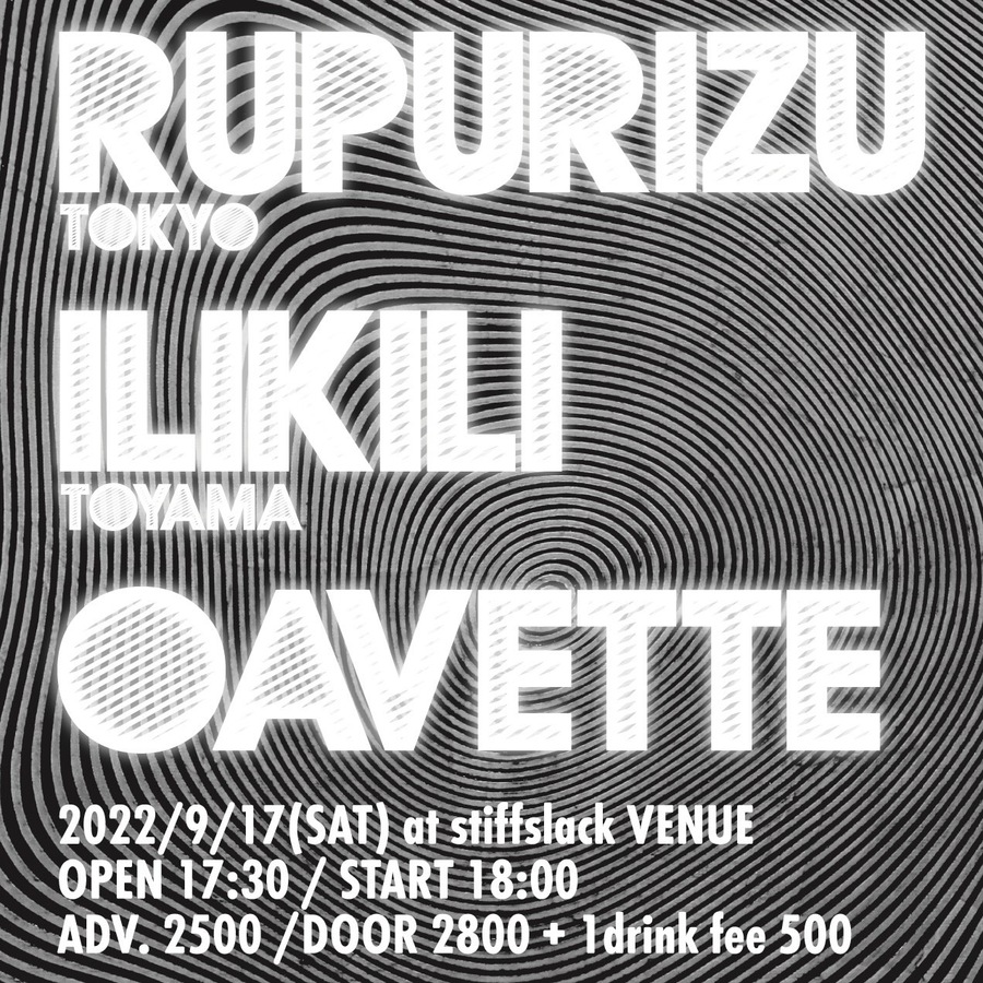 名古屋発人力ミニマルテクノカルテット"OAVETTE"による自主イベントがstiffslack VENUEにて開催!! 対バンはこちらもドープ&ストイックなミニマルサウンドを鳴らす!!東京のミニマルポストロック"RUPURIZU" また富山よりSMOUGのメンバーによるミニマルアンビエントユニット"ILIKILI"が初登場!! 三者三様のドープ&ストイックな音像に酔い知れましょう!!必見!!