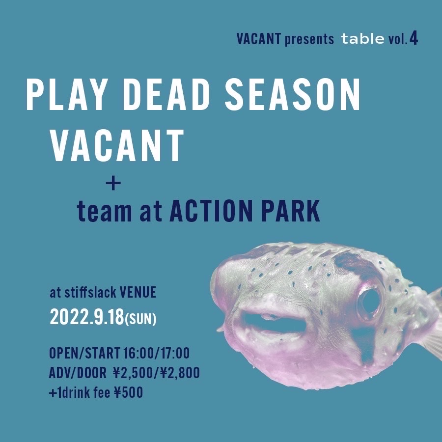 202209/18(Sun)![]() VACANT presents "table" vol.4PLAY DEAD SEASON VACANT presents "table" vol.4PLAY DEAD SEASON