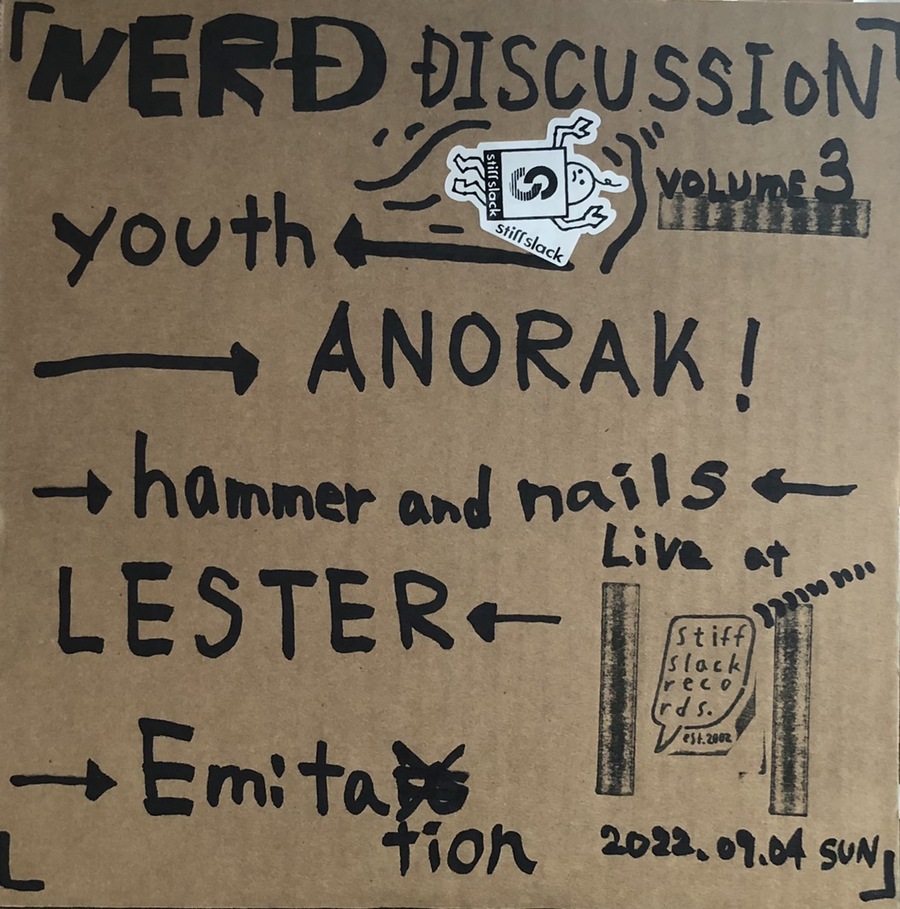 名古屋のトゥインクル日本語EMO"youth"による自主企画"Nerd Discussion"のvolume 3が開催!! 久々登場の東京EMO"ANORAK!"と先のライブにて鮮烈なパフォーマンスを披露した千葉産王道EMO"LESTER" そしてstiffslack VENUE初登場の三重産アダルトEMO"hammer and nails"!!そして久々且つおなじみ名古屋のショートチューントゥインクルEMO"Emitation"が登場!!EMO/インディーロックの枠組みの幅広さを体感できる一夜です!! 直前にメンバーチェンジしたてのgood luck with your funも参戦決定!!