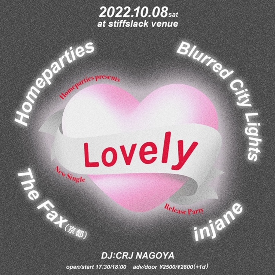 stiffslack VENUEでもお馴染み名古屋のインディオルタナポップ"Homeparties"によるNew Single"Lovely"のリリースを記念した自主企画が開催!!対バンには京都のインディポップバンド"The Fax"、名古屋から結成より間も無く密かな話題を呼んでいるドリームポップ/シューゲイザーバンド"Blurred City Lights"がstiffslack VENUE初登場!!そして転換BGMにはCRJ NAGOYAの面々にてフロアを盛り立てます!!