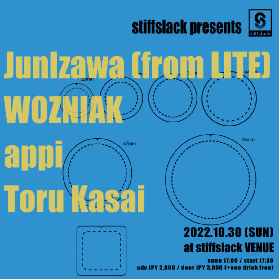 秋から冬へと季節の変わり目に日本から世界へ発信し続けるインストロックバンドLITEよりベースJunIzawaのソロセットがstiffslack VENUEに久々に降臨!!対バンにはSS初登場ミニマル、テクノ、ダブステップ等様々な音楽をマッシュアップ更新し続けるマルチインストゥルメンタリスト星優太によるプロジェクトWOZNIAK!!京都より最早おなじみappi、地元名古屋からはToru Kasai。実験的かつ肉感的な一夜となるでしょう!!