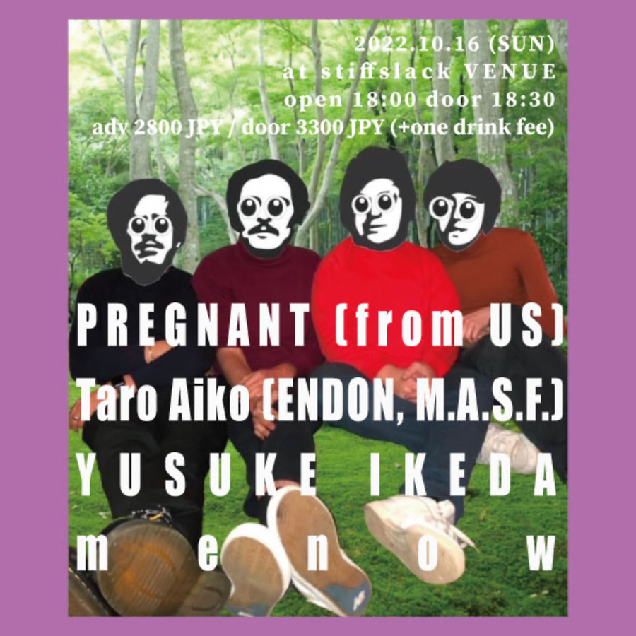 USカリフォルニア州都のサクラメントを拠点に活動するマルチアーティストDaniel Trudeauを中心とする楽団。"PREGNANT"の来日ツアー名古屋場所がstiffslack VENUEにて!!dirty projectors,Animal Collective的なサイケデリック、実験性を持ちつつも奇妙なほどポップな楽曲、そして強靭なグルーブを兼備しております。対バンにはENDON,M.A.S.Fでお馴染み"Taro Aiko"による美しさを感じる程のノイズと低音マシンライブ、フルレングスのレコーディングを終えて深化が止まらないエクスペリメンタルインディーフォークデュオ"menow"、深淵な美しい歌声とひりついたポップネスを表現し続けるSSW"イケダユウスケ"が登場です!!