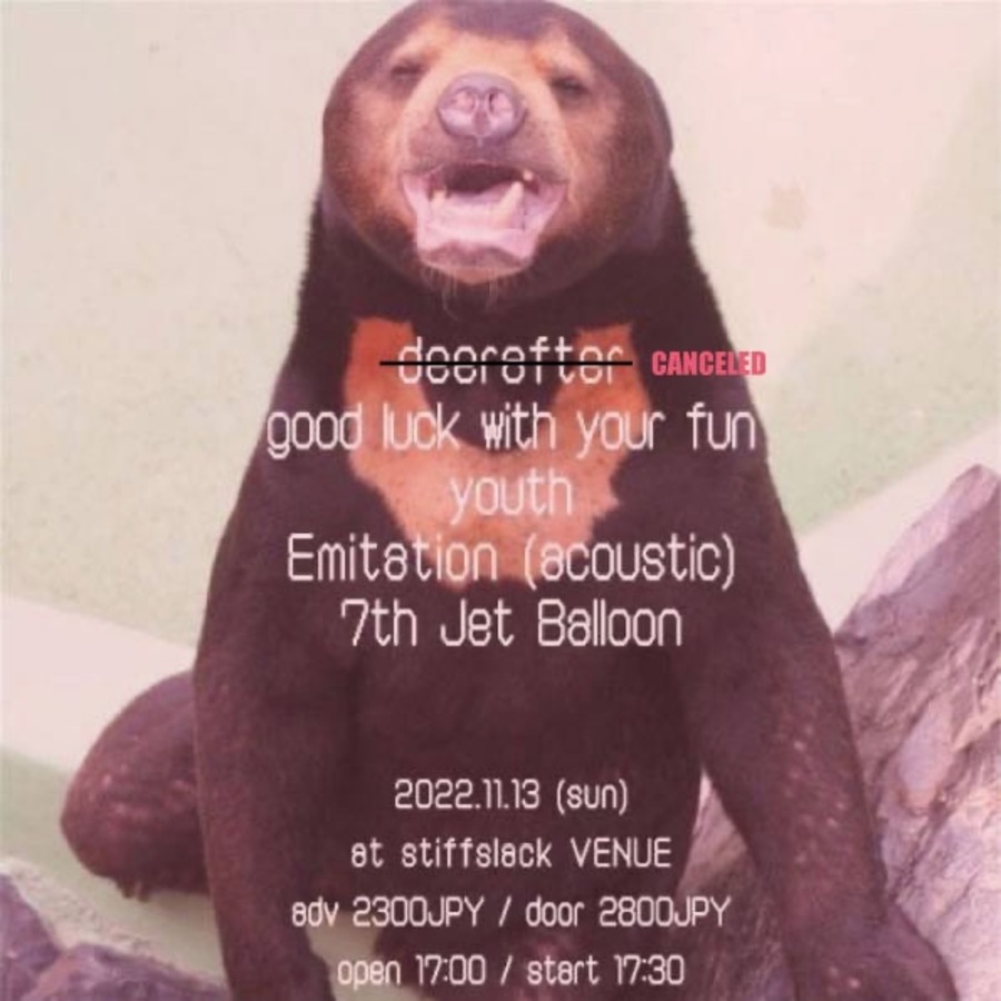 北海道産トゥインクルEMO"deerafter"が遂にstiffslack VENUE初登場!!対バンは名古屋の盟友ともいうべきgood luck with your fun、若手日本語トゥインクルEMO"youth"にEmitationがこの日はアコースティック編成にて!!