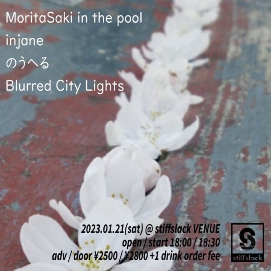 関西シューゲイズ/ドリームポップ/インディロック要注目バンドMoritaSaki in the poolがsitffslack VENUE初登場!!昨今の海外インディならALVVAYS、SSスタッフ的な文脈であれば1st期のDROPNINETEENSのような爽やかさと透明感、爆発力そして何より楽曲の質の高さが魅力のバンドです。対バンにも名古屋ローファイインディロック注目株"のうへる"がPAVEMENT,BULT TO SPILL,POLVOのような捻れたガレージポップなアンサンブルの中にファニーかつ異様に癖になる女性ヴォーカルが特徴的、そして久々登場名古屋のグッドソング、ドリーミーインディロックバンド"injane"と最早お馴染みになってきた名古屋、岐阜のバーストシューゲイズトリオBCLこと"Blurred City Lights"!!名古屋、京都の注目の若手が揃いました!