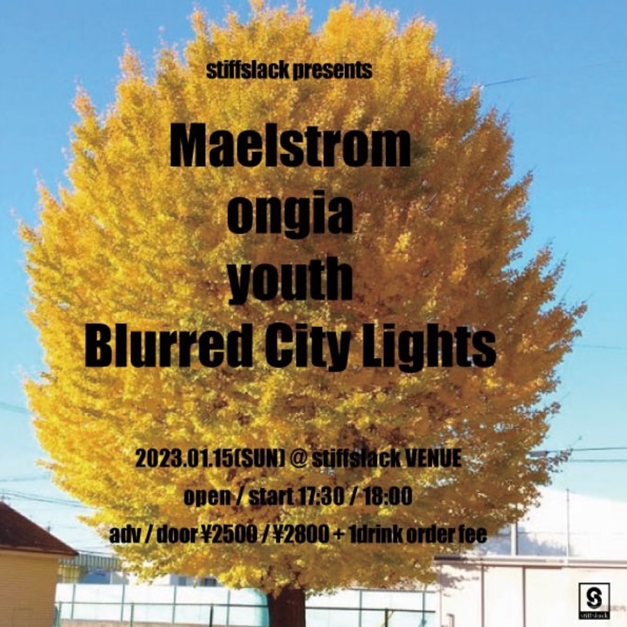 岡山産、ビューティフル日本語EMO/ポストロックバンド"Maelstrom"がstiffslack VENUE初登場!!流麗なギターアンサンブルの隙間をたゆたうように差し込まれる美しい日本語詞は新感覚かと!!そしてこれまた初登場、東京のガールズプログレッシブインストマスロック"ongia"、don cabarello,HELLA,faraquietの如き壮絶かつクールネスそして少しだけシュールなアンサンブルに期待しかありません。そして地元名古屋よりとんでもない勢いで成長を続けるオルタナシューゲイズトリオBlurred City Lightsとこちらも成長が止まらないトゥウィンクルジャパニーズナードEMOトリオyouth、新年から盛り沢山の内容です!
