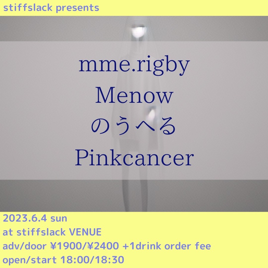名古屋のアク強めなインディアーティストが登場!!先日のレコ発で新たなステージの幕開けを予感させまくったアンビエントフォーク/スロウコアデュオ"Menow"に、久々登場屈折ガレージロック"のうへる " そして初登場の二組はUKガレージと日本語ロックの美しきマッシュアップとも言える新星"mme.rigby"と、 スーパーサッドSSW"桃蟹"所属のエレクトロポップバンド"Pinkcancer"が初ライブです!!