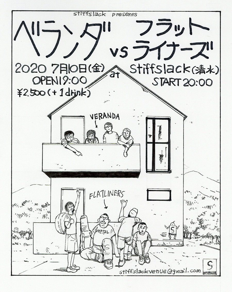 情景的且つフォーキー、メロウ、ポップで親しみ易いメロディ、詩情を持ちながらもどこか狂気を内に秘めた日本語インディロックバンド"ベランダ"とただひたすらにいなたく赤裸々な詩情と情けなさをPAVEMENT、ニールヤング、オルタナティブロックへの情に焦がれるバンド"フラットライナーズ"が7月の金曜の夜にSSにて激突です。