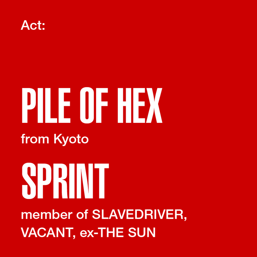 2019年にリリースされた初の公式音源"Introse"がSSでも大好評だった京都からルイビルポストハードコアへの回答とでも言うべきベースレスオルタナティブトリオpile of hexが京都より初来名。対する名古屋からはSLAVEDRIVER,VACANT,good luck with your fun,元the SUNのメンバーにて結成されたポストハードコアカルテットSPRINTが登場、彼等は本公演が初ライブとなります。