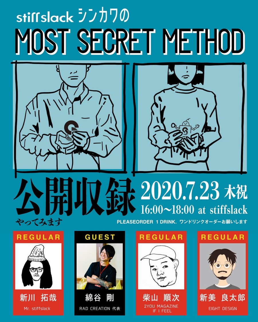 STIFFSLACKシンカワが様々な議題についての小話、ゲストを招いてのガチンコ&ぶっちゃけトークなどなどyoutube "STIFFSLACK"チャンネルにて配信している番組"MOST SECRET METHOD"ですが今回は名古屋を拠点に複数のライブハウス、飲食店、アパレル事業を展開するまでに成長しているR.A.D グループ代表 綿谷剛氏を迎えての初の公開収録をしてみます。番組では編集されちゃう情報も拾えちゃうかも?20名限定です。