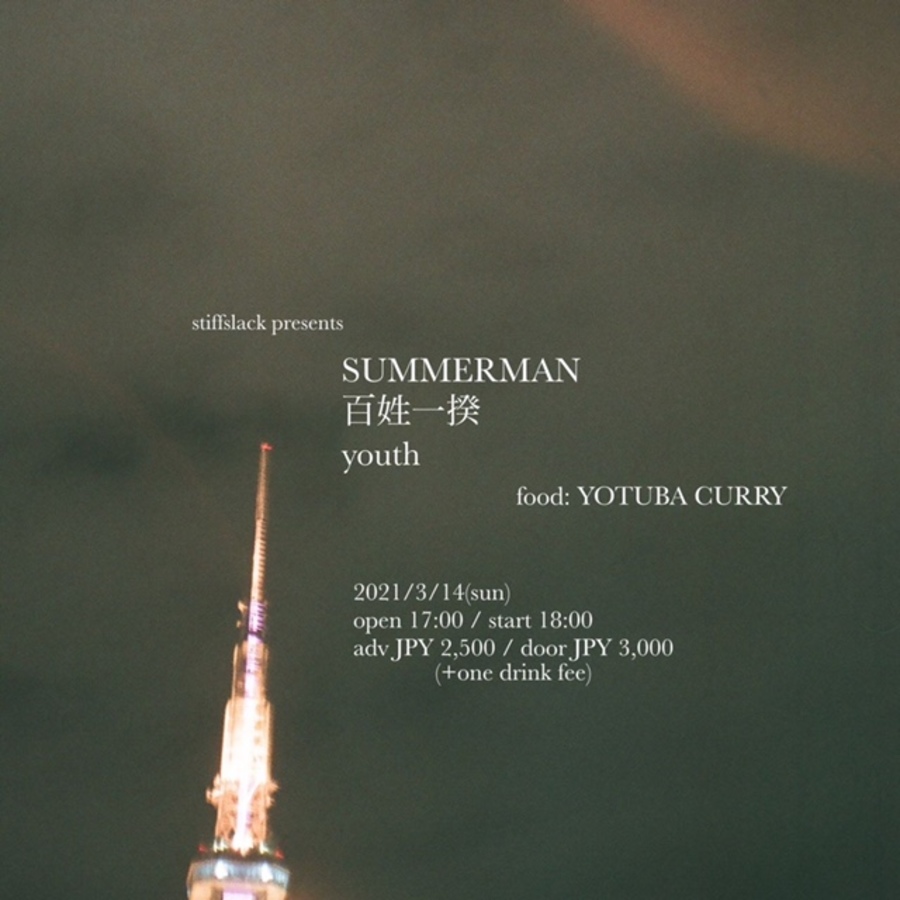 2021年のホワイトデーに東京からグッドソング連発EMO/インディーロックバンド"SUMMERMAN"、静岡は三島市のオルタナティヴロック/ポストハードコアバンド"百姓一揆"がstiffslack venue初登場!対する名古屋からは名古屋若手日本語EMOトリオyouthが登場!