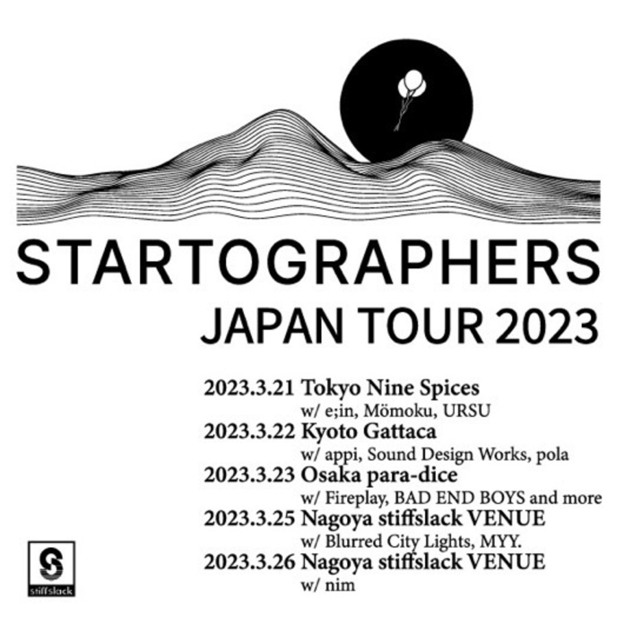 「STARTOGRAPHERS」の来日公演が決定。 インディーロッ ク / ドリームポップ / ポストパンク / シューゲイザー /ポストロック /ブリットポップ ... など 、その楽曲からも想 起される様々な サウンドを吸収しながら、多彩な表情を見せるエフェクティブなギ ターが特徴の研ぎ澄まされた楽曲、そして印象に残るメロディーを 力強く歌い上げるヴォーカルでSHINER、HUM、 SWERVEDRIVER、RIDE、NOTHING、DIIV などのファンは是非ともご来場ください。シューゲイズエモ系バン ドの真打ち かつ最終兵器たる STARTOGRAPHERS の珠玉のサウンド を是非とも体験してもらいたいです。 名古屋DAY2の対バンは京都の轟音オルタナエモーションの至宝"nim"!!