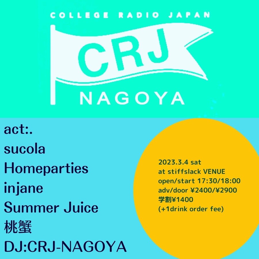 最近の学生のトレンドミュージックカレッジチャートを発信している団体CRJ-NAGOYAによるイベントがstiffslack VENUEにて!!出演は過去のチャートにもランクインしているアーバンシティポッププロジェクト"sucola",異様に癖になるサイケデリックインディロック"injane",グッドソング連発パワーポップ"Homeparties"やマイペースにどこか癖になるハッピーサッドな楽曲を歌うSSW"桃蟹"、窓際のロマネスコでも活躍するシンガー"CHANG-MiSA"率いるニューポッププロジェクト"Summer Juice"!!
