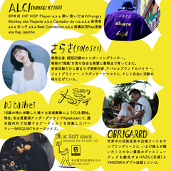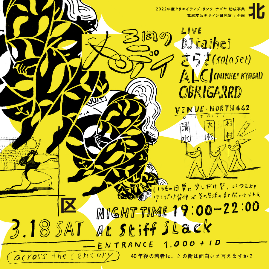 名古屋市北区の街を賑やかに!!名古屋市北区というの魅力を発信するイベント"3月のメロディ"のNIGHT TIMEイベントがstiffslack VENUEにて!出演は飛ぶ鳥を落とす勢いで評価を高めているSSW"さらさ"、東海圏を拠点とする実力派ラッパー・ALCI、東海を代表するHIP HOP、ダンス、ブレイクビーツミュージックレジェンド"OBRIGARRD"にDJ taiheiにより締めくくりです!!