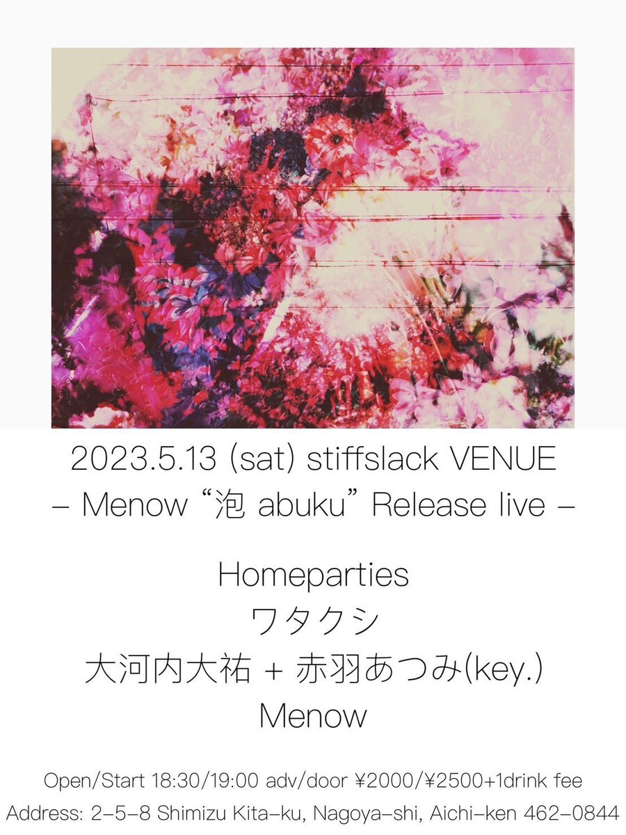 名古屋産アシッドフォーク/スロウコアデュオ"Menow"の1st Album「泡 Abuku」のリリースを記念したイベントがstiffslack VENUEにて!!グッドソング連発インディロック"Homeparties"、真っ直ぐ斜めに実直な歌を放つロックバンド"ワタクシ"に洒脱で気怠くもどこか危険なSSW"大河内大祐 + 赤羽あつみ"という一癖も二癖もある共演者にて!!!!