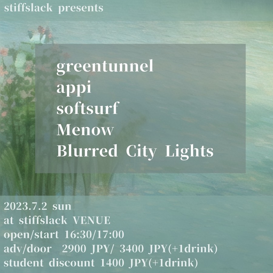 東京よりSigur Ros、HAMMOK直系の美麗アンビエント、シューゲイズサウンドを鳴らすgreentunnelが名古屋初登場!!そして久々登場、京都のnimの紅一点ギタリスト"hisana"によるビューティフルポストロック/シューゲイズプロジェクト"appi"、地元名古屋からはsoftsurf、Blurred City Lights、Menowとありそうでなかった組み合わせをしてみました。アンビエント、スロウコア、シューゲイズ、EMO、ポストロックを多方面からご堪能くださいませ!!