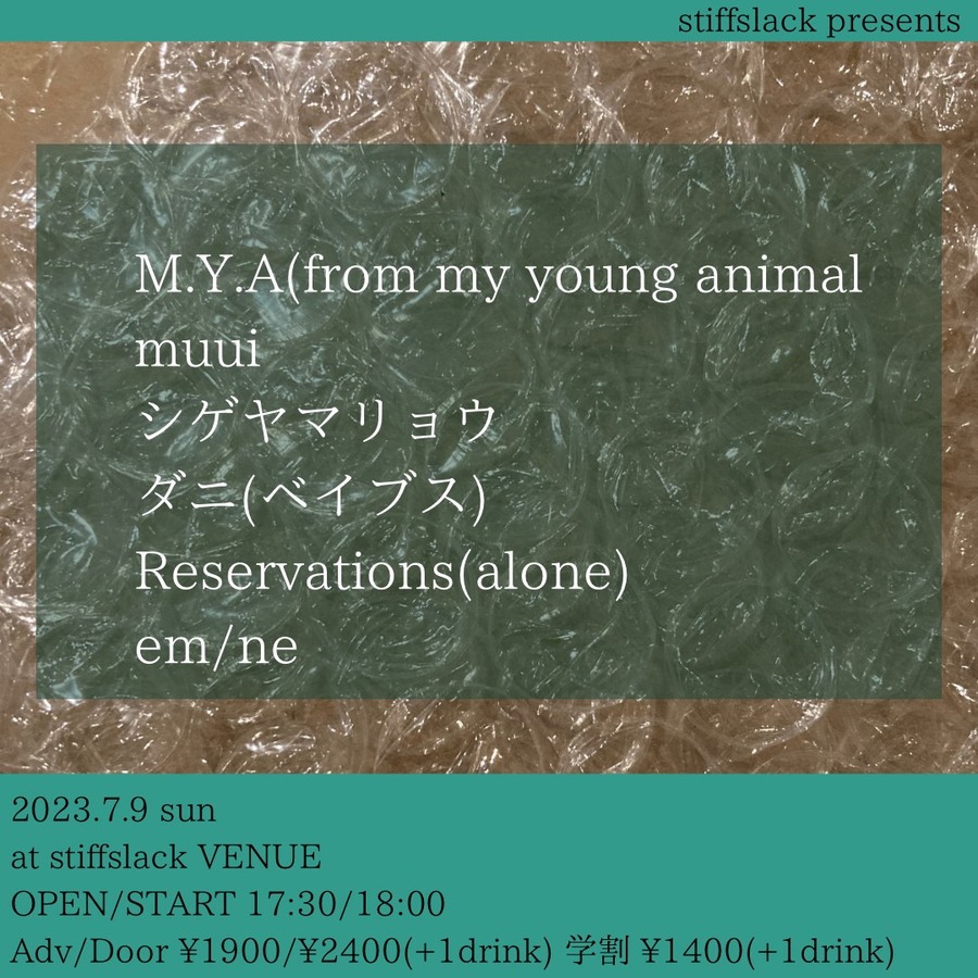 夏の夜に十人十色のフォーキーナイトが開催、岐阜産ビューティフルインディロック"my young animal"よりW山口氏によるユニット"M.Y.A"、サッドインディフォークを基調にメキメキ力をつけてきている"muui"、そろそろバンドも始動?トゥインクルEMO meet Jロック SSW"シゲヤマリョウ"とSS初登場のローファイインディフォーク"ダニ(ベイブス)"、こっそり曲作りためてますSSスタッフTAPIによる不定形プロジェクト"Reservations"が久々にやります。そしてそして、Blurred City LightsよりVo/Ba 神谷のソロ名義"em/ne"も緊急参戦!!