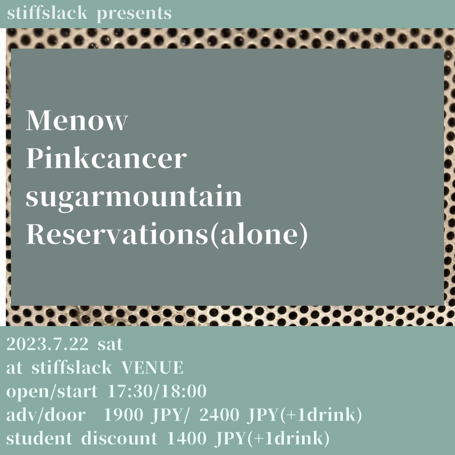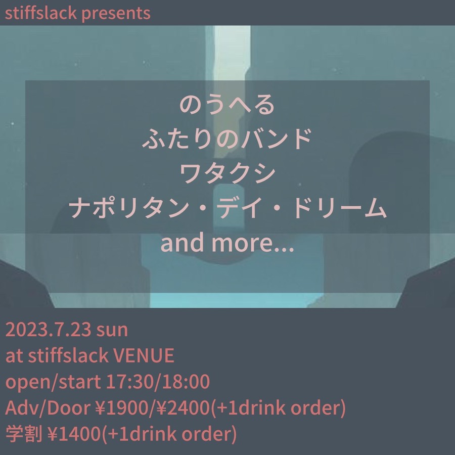 OPEN 17:30 / START 18:00Adv ¥19,00 / Door ¥2,400 +1drink(¥600) 学割 ¥1,400 +1drink(¥600)チケット前売・ご予約は店頭またはメールフォームで