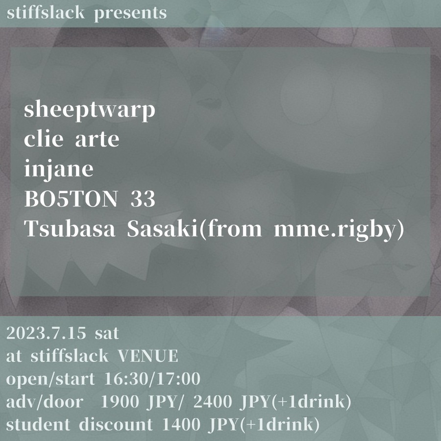 先日のピンチヒッター兼復活ライブでも変わらない存在感を放った三重のマスロックトリオsheeptwarpが早くも再登場!!対バンにはやたらとクセになるサイケデリックインディポップ/ロック"injane"に最早お抱えの若手オルタナティブロック"clie arte"にこちらはSS初登場の現役大学生トゥインクルEMO"BO5TON 33"が登場。そして先日のライブでも王道UKロックと日本語詞を織り交ぜた楽曲を放っていたmme.rigbyよりフロントマンTsubasa Sasakiがソロで登場!