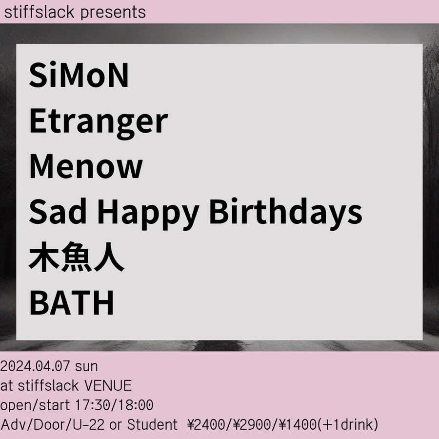 国内外に活躍の幅を広げる孤高のSSW"SiMoN"が久々にSS登場!!対バンには先日の初来名にて大きな爪痕を残した北九州の才女"Etranger"、名古屋スロウコア/インディフォークデュオ"Menow"に最近お馴染みの三重産エクスペリメンタル/インディロック"BATH"にSS初登場の木魚人にKatie Ford再スタートなインディフォーク/ロックユニット"Sad Happy Birthdays"の初陣となっております。