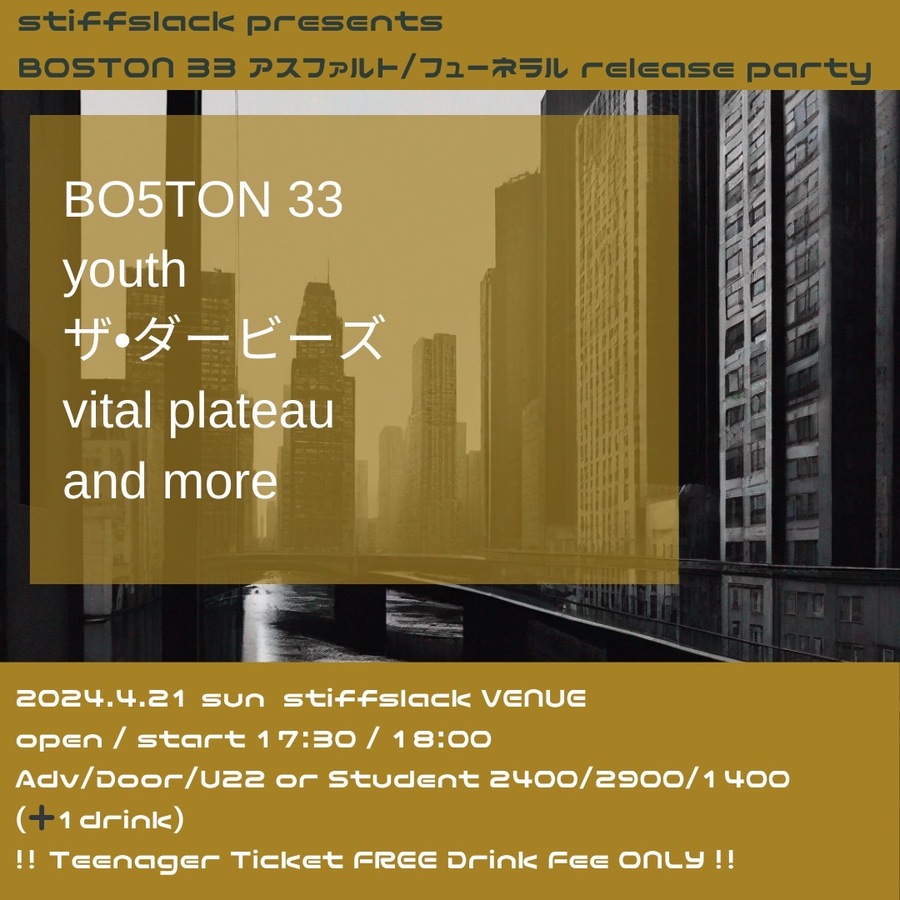 名古屋の新鋭EMO"BO5TON 33"が突如配信シングル「アスファルト/フューネラル」をリリース!!!!そんな彼らの祝してリリースパーティを開催です。名古屋の日本語EMO"youth"に最近上昇気流に乗っているインディロック"ザ・ダービーズ"にプログレッシブポップEMO SSW"シゲヤマリョウ"が遂にバンド編成で始動の"vital plateau"の初ライブ!!