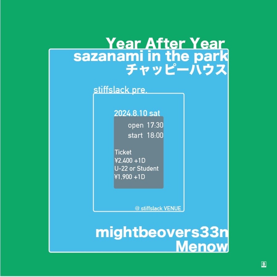 京都のカラフルでポップなサウンドと爆音サウンドの平衡点を攻めるYear After Yearが久々に!!先日のライブでは初期〜中期のFlaming Lipsのようなサイケデリアをぶちかましたチャッピーハウスが早くも登場で、遂にネクストステップに足を踏み込みつつある名古屋産スロウコアデュオMenow、名古屋のクラムボンライクなインディロックを鳴らすsazanami in the parkに元pinkcancerのコンポーザー/トラックメイカーおにぎり君による新プロジェクトmightbeovers33nというなんだか賑やかな夜になりそうです。