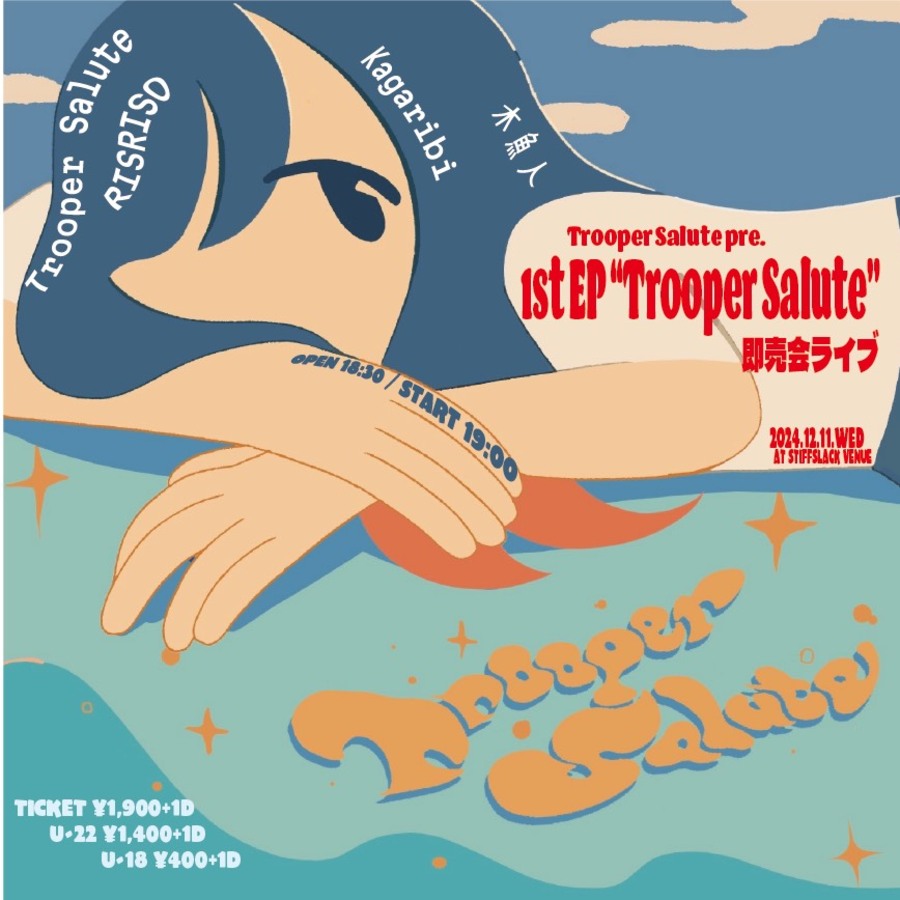 名古屋発シンフォニックインディロッククインテット"Trooper Salute"による1st EP "Trooper Salute"の記念すべきリリース日に即売会ライブ!! ジャパニーズロックの偉大なる先達のあらゆるエッセンスの影響を受けに受けまくってロック/ポップス/プログレ/マスロック/ポストロックの垣根を縦横無尽にそして限りなくポップに破壊的にアウトプットしまくり僅か一年で全国的な認知を、拡げてきた彼らのこの1年の集大成。当日を盛り立てるのは彼らにゆかりの深い正統派日本語ロック"kagaribi"、THE 1975〜スーパーカーを横断するエレクトロシューゲイズ"RISRISO"に名古屋のbet cover的な佇まいからオリジナル過ぎるプログレッシブ日本語ロックを生み出している"木魚人"という名古屋の若手の層の厚さを見せ付ける布陣となります。