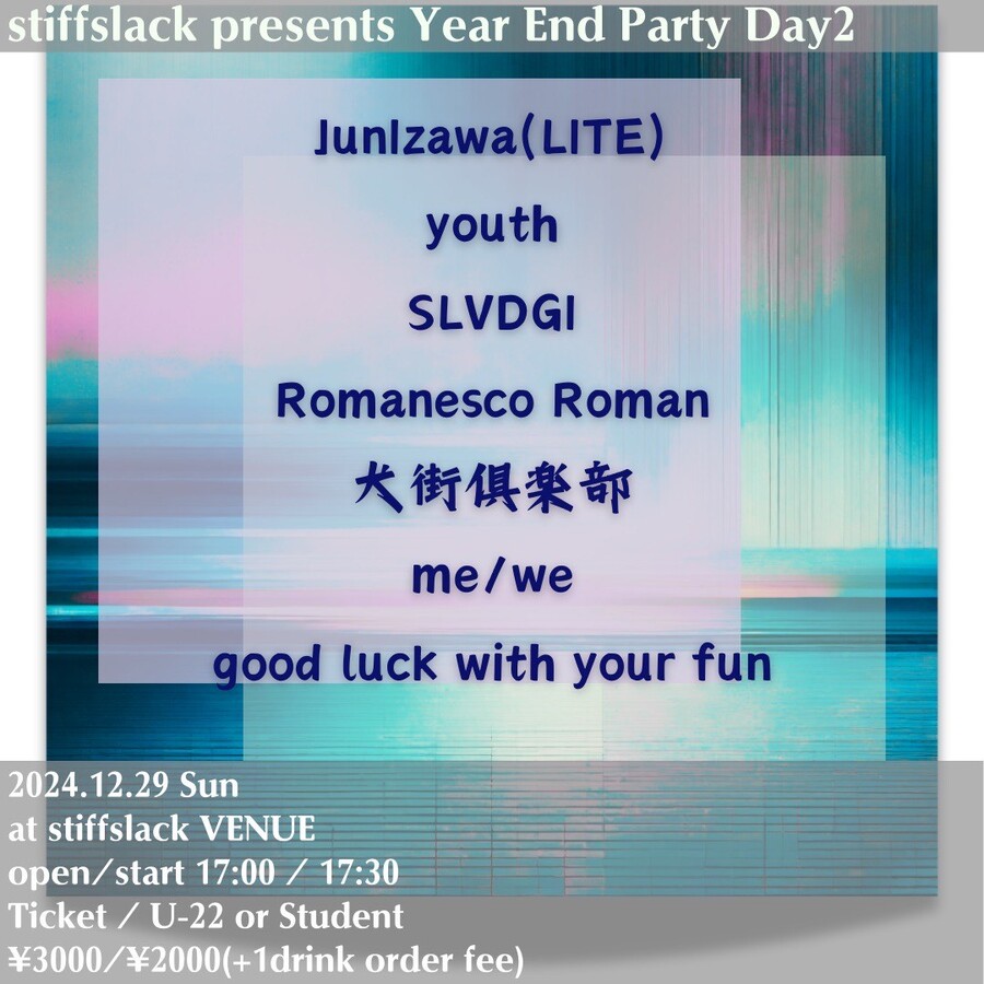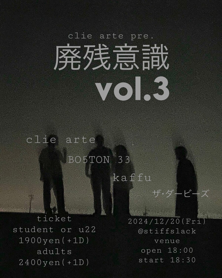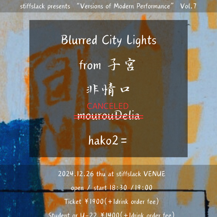 平日も出演ありがとう最早全国にその名を知らしめる名古屋歌心シューゲイズ筆頭"Blurred City Lights"が2024年ラスト出演!!そして対バンには先日のライブでも強烈なインパクトを残したmourouDelia,from 子宮の再登場にこちらは初登場きぬかもめのカミジちゃんニューシューゲイズプロジェクト非情口!!平日なのにめちゃくちゃ濃厚な夜をお届けします!!年末だし!!先日印象的なパフォーマンスをみせてくれたhako2=も急遽参戦です!