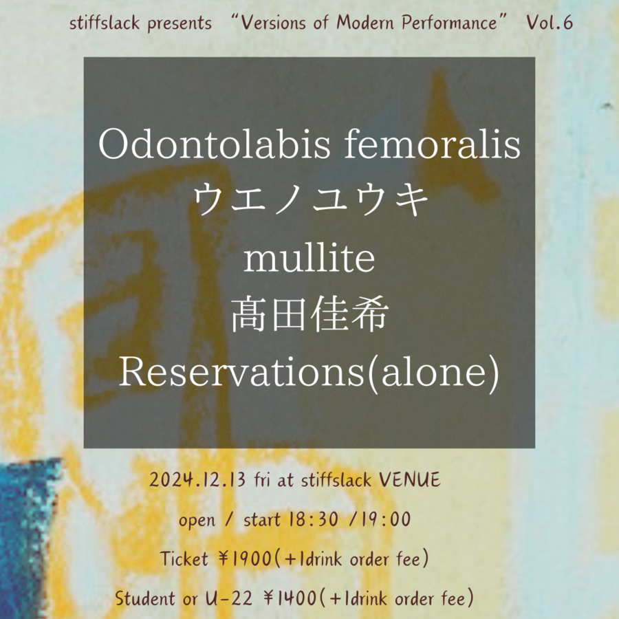 先日のHigasaki活動休止ライブでも鮮烈な歌とサイケデリアを歪にそして純度高く表現"髙田佳希"、THANK YOU MY BLOODのVo/Gt,ワタクシGtとしてお馴染みブッチャーズ直系の歌心と90s J-ROCKの旨味たっぷりのメロディセンスの持ち主"ウエノユウキ"、こちらはSS初登場の多治見産インディポップ/ロック"mullite"、そしてSSスタッフTAPIによる不定形プロジェクトこれまでの音楽遍歴をインディフォーク/ロックに落とし込み中"Reservations(alone)"にどうしても年内にもう一回誘いたかった名古屋の隠れた若手良ポストハードコア"Odontolabis femoralis"が登場!!