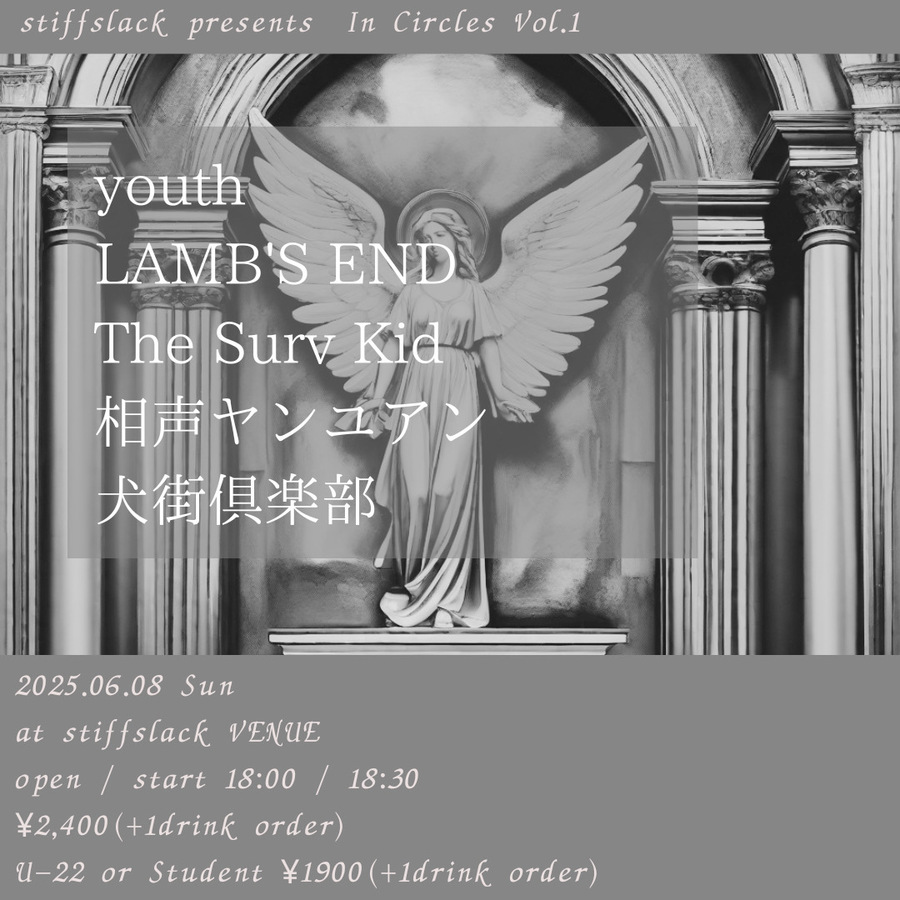stiffslack VENUE新イベントEMO/インディロック特化型イベント(そもそもそういう毛色のバンドは多いですが)"IN CIRCLES"を発足!!第一回目はお馴染み名古屋の日本語EMOトリオ"youth"、そして恐ろしいスピードで成長を続ける超若手EMO/Skramz "LAMB'S END"に、EMOを基軸に柔軟なサウンドスタイルと骨太な演奏と歌心にポテンシャルを感じるTHE SURV KIDに、CARD,dOPPO等PIBACK,PAVEMENT的に隙間多めなアンサンブルとソリッドで自由奔放な演奏が魅力の相声ヤンユアンという濃厚な一夜です。