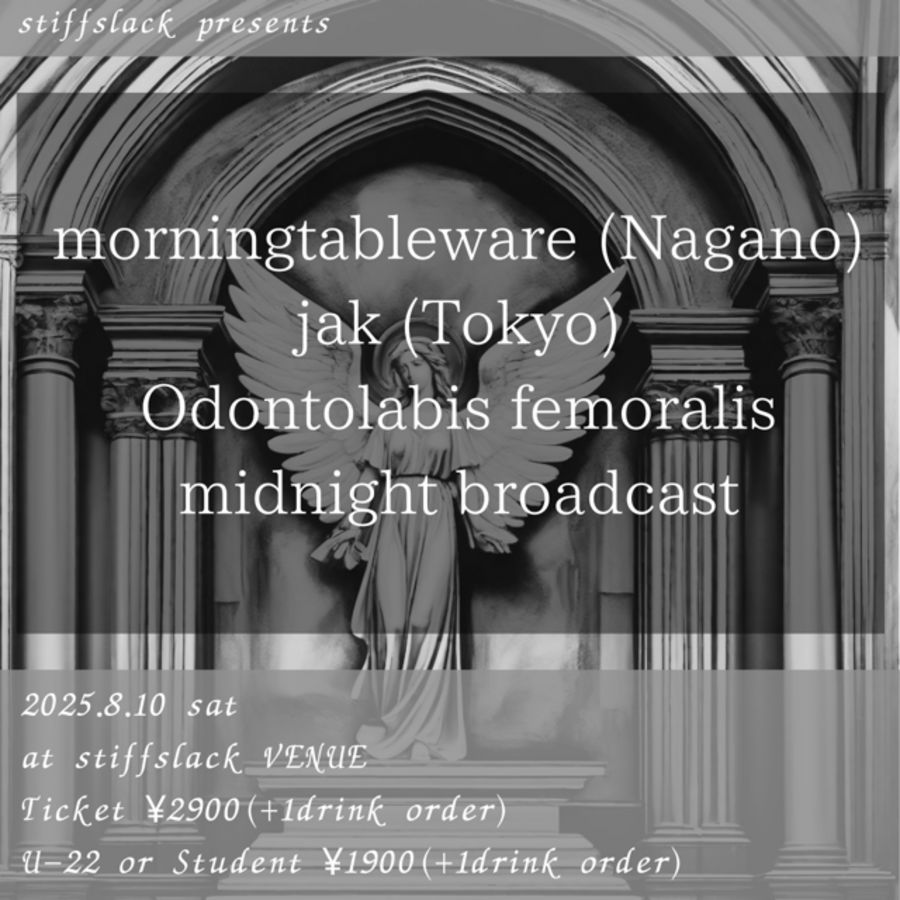 2005年結成長野の知る人ぞ知るジャパニーズサッドEMO最高峰"morningtableware"が初の公式音源"humanity EP"を引っさげて久々にstiffslack VENUEに降臨!! Mineral,Engine Down,Coboltのような内情をぐつぐつと煮えたぎらせる独自のサッドコア/EMOサウンドは孤高です。そしてこちらは初登場東京カオティックHC/POST HC "jak" SHELLAC直径の硬質ギターサウンドにTHIS HEAT,GANG OF FOURさながらなポストパンクグルーヴとDrive Like Jehu由来であろうハードドライヴィンなポストハードコアサウンドも搭載した要注目のバンドです。