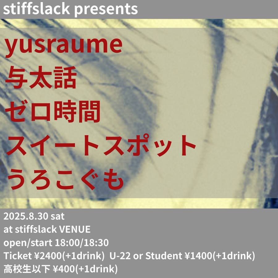 そんな癖強3バンドに対峙するのは8月は2回目、唄心とシューゲイザーベースのギターロックを邁進中の"スイートスポット"にSS初登場のニューカマー"うろこぐも"というフレッシュさと内容確定な晩夏です。
