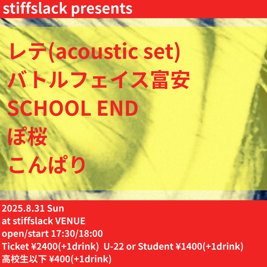 そして、Uhdeでもお馴染みの"バトルフェイス冨安"に高校生インディロック"SCHOOL END"、SSW"こんぱり"も初登場というこの日はチャレンジングで刺激的な一夜です!!