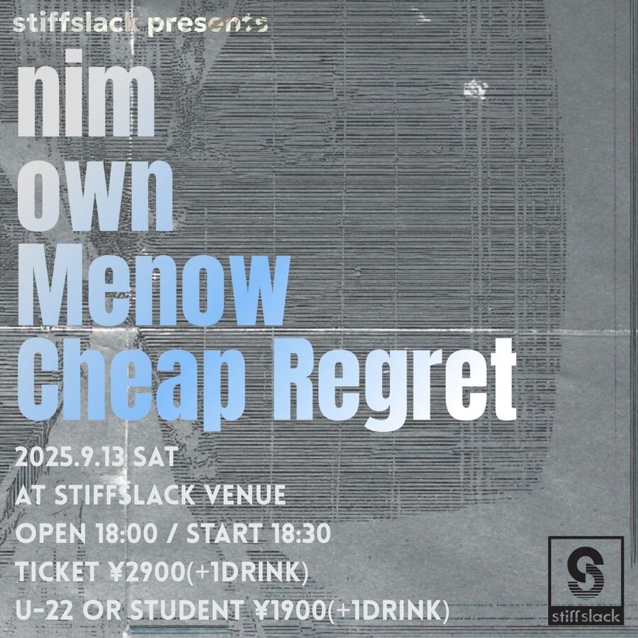 京都のEMOGAZE代表nimが久々にSSに降臨!!対バンにはいつかやらせたいな〜と思っていた長野は松本産超実力派EMOGAZE"own"に、インディロック、ドリームポップ、ポストパンク、シューゲイズを横断する新鋭ユニット"Cheap Regret"に今春のUSツアーを経て音楽の解像度やスケールが一段次のステージに到達した名古屋産エクスペリメンタルフォーク/インディフォークデュオ"Menow"という濃厚な一夜となります。