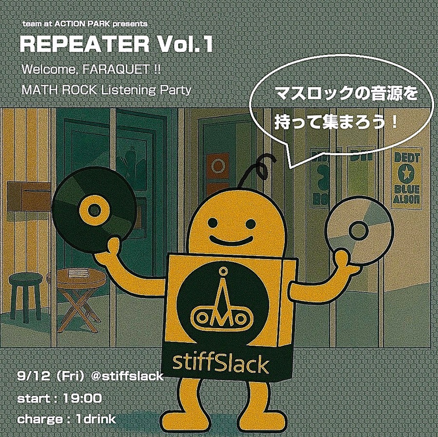 第1回目となる今回のテーマは「マスロック」。この日が来日ツアー真っ只中となるFARAQUET、 10月に来日を控えるSELF- EVIDENTはどちらも本会場stiffslack公演があり ます。両雄への期待感を高める夜にしましょう!